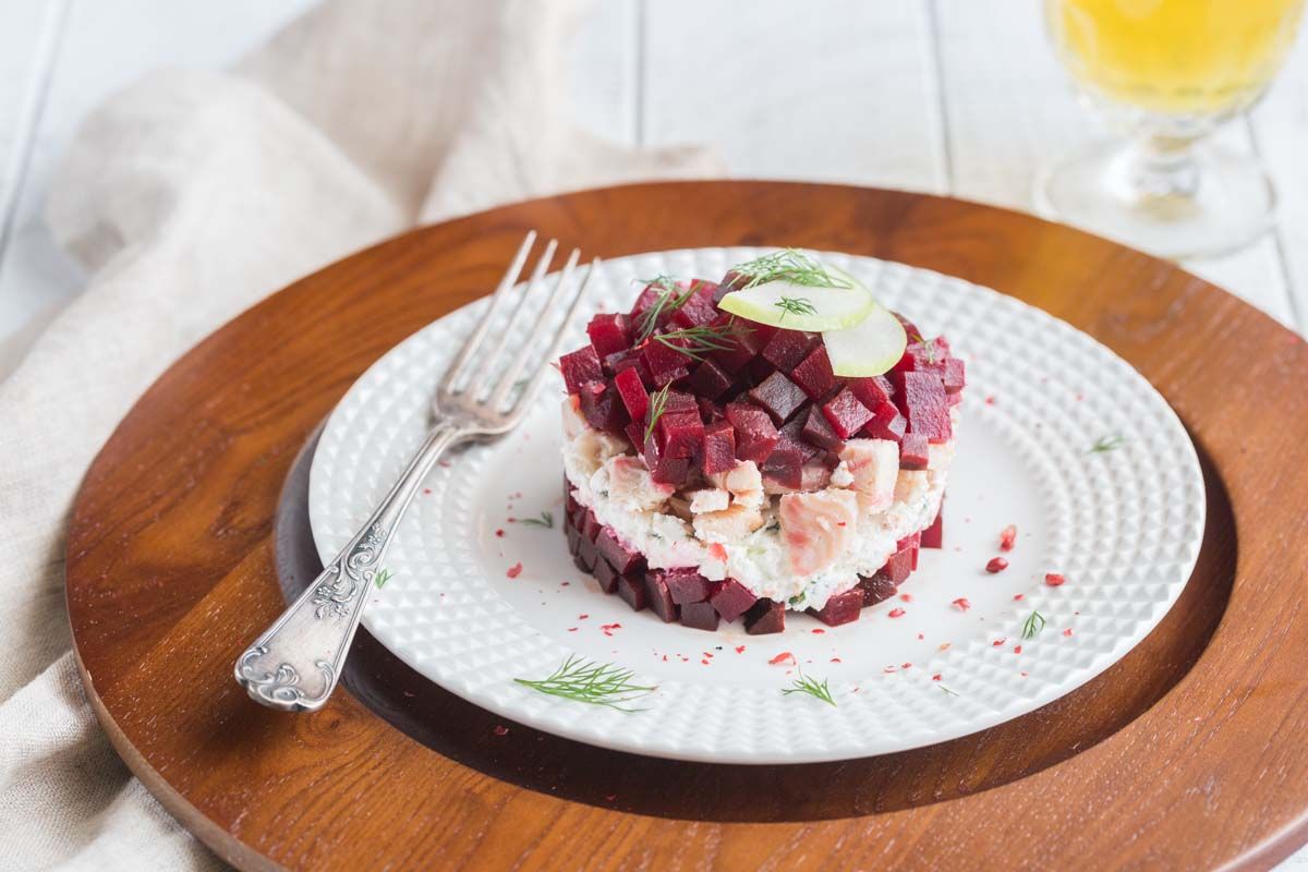 - Dans un cercle ou une verrine, dressez vos ingrédients en ordre : d'abord les dés de betterave, puis le fromage frais, suivi de la truite, et terminez par une couche de betterave. Réservez au frais pendant une heure.
