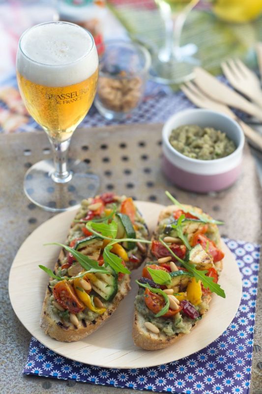 Sur chaque tartine, étalez du caviar d’aubergine et garnissez de poivrons, de tomates, de cubes de courgettes et de raisins secs. Finalisez avec des pignons grillés et ajoutez des feuilles de roquette. Dégustez !