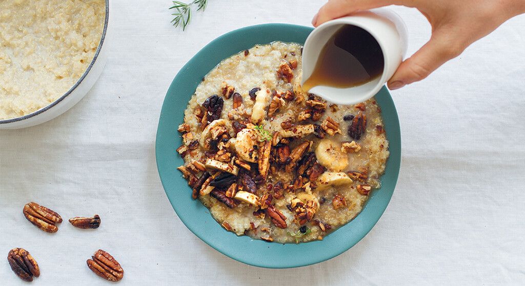 - Servez le quinoatmeal dans des assiettes creuses, ajoutez les rondelles de banane, les noix de pécan, un filet de sirop d’érable, puis sel et éventuellement une touche de cannelle ou de thym citron au goût.