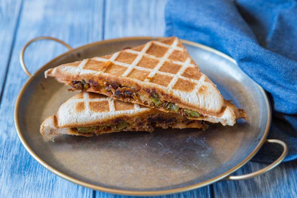 - Sur 4 tranches de pain, disposez la préparation de viande, puis ajoutez deux tranches de cheddar. Refermez les croques et faites-les griller dans un gaufrier ou au four.