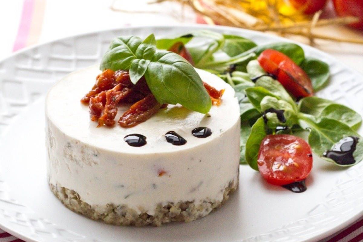 - Travaillez le reste de la ricotta avec 2 cuillères à soupe d'huile des tomates pour l'assouplir. Ajoutez la crème, les tomates séchées et le basilic. Salez et poivrez. Versez ce mélange sur la croûte de pignons et placez au frais pendant au moins 4 heures pour faire prendre le cheesecake. Servez avec une salade et un filet de crème de balsamique.