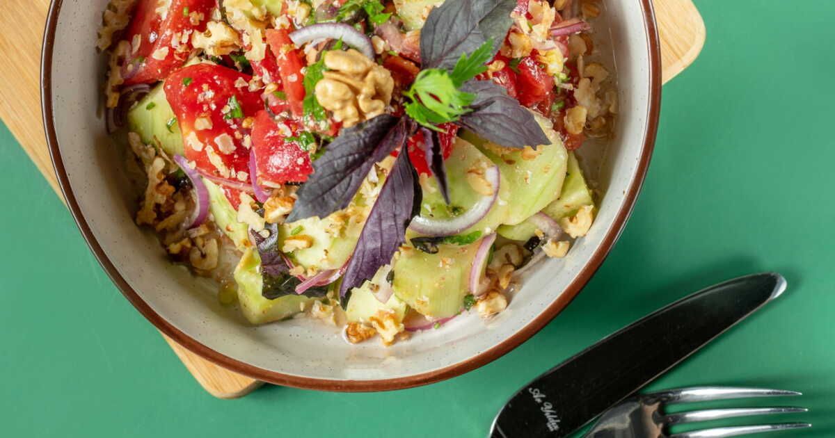 Dans un saladier, versez 280 g de boulgour, salez et recouvrez d'eau bouillante pour le réhydrater. Couvrez d’un torchon propre et laissez reposer environ 8 minutes, tout en suivant éventuellement les indications du paquet. Il faut garder à l’esprit que le boulgour continuera à absorber l’humidité de la sauce. Une fois le temps écoulé, égrainez le boulgour à la fourchette et mélangez-le doucement avec la sauce jusqu'à absorption. Pendant que le mélange se tiédit, découpez une tomate cœur de bœuf et un demi concombre en petits dés. Ajoutez environ 4 brins d’aneth et de persil hachés. Incorporez ces ingrédients au boulgour, assaisonnez selon votre goût, puis terminez avec un filet de crème de balsamique. Mélangez une dernière fois et servez tiède ou bien frais.