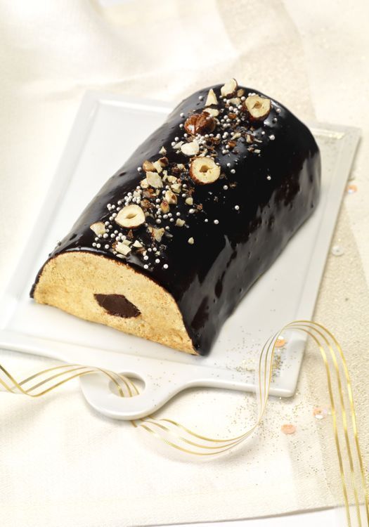 Démoulez la bûche sur une grille, versez le glaçage refroidi sur le dessus, laissez reposer quelques instants. Décorez avec les noisettes caramélisées et quelques billes en sucre pour la touche finale.
