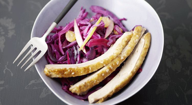 Pour le côté accompagnement, commencez par couper le chou rouge en quartiers. Retirez les parties blanches ainsi que les feuilles extérieures souvent abîmées, puis émincez le tout. Dans une cocotte, mélangez le chou émincé avec des raisins secs et du cumin. Ajoutez un peu de vinaigre de cidre et assaisonnez avec 1 cuillère à café de sel de Guérande et du poivre. Couvrez et laissez mijoter à feu doux pendant 2 heures, en remuant régulièrement. Environ 30 minutes avant la fin de la cuisson, incorporez les pommes coupées en dés.