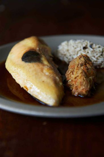 Dressage : Découpez la poularde et servez avec du riz, de la farce et un peu de bouillon. Parsemez de fleur de sel pour une touche finale.