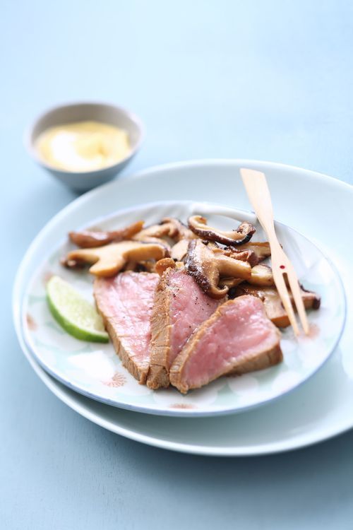 Découpez le veau en tranches de 1,5 cm d'épaisseur, en veillant à ce qu'il soit rosé au centre. Disposez environ 5 tranches par assiette, ajoutez les shiitakes, assaisonnez de poivre, d'un filet d'huile d'olive extra vierge, de sauce soja et de citron vert.